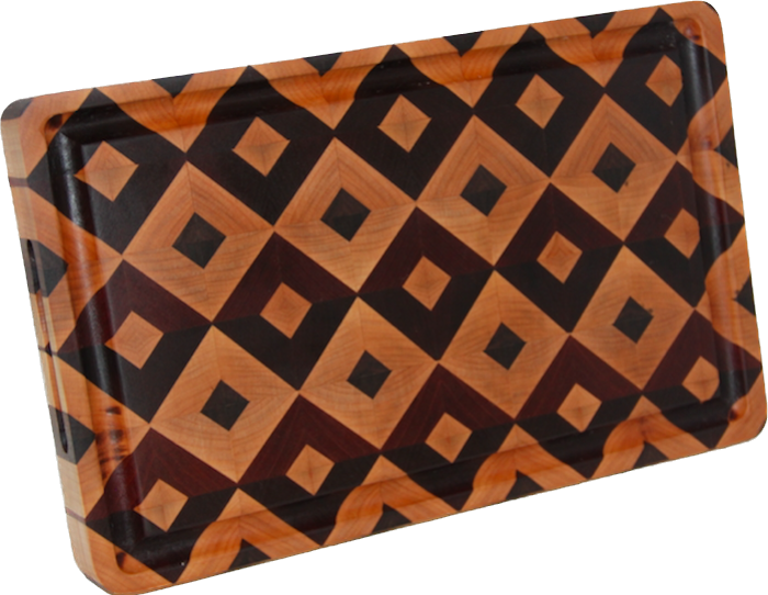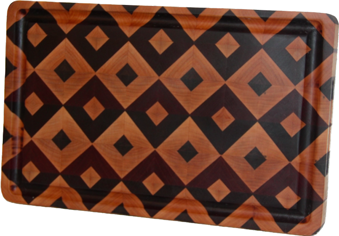 Elevate your kitchen with this one-of-a-kind, end grain cutting board—a masterpiece of craftsmanship that will never be replicated in the exact same way. Its intricate diamond pattern and premium selection of Walnut, Cherry, and Maple woods blend together in an artful display of elegance and precision. Meticulously handcrafted, each piece of wood is arranged to create a captivating design of interwoven diamonds, evoking a sense of endless depth and beauty.